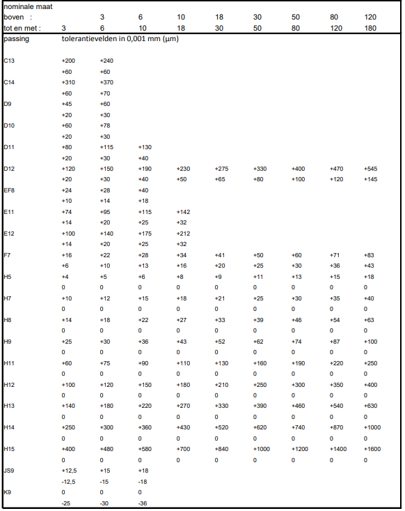 Hieronder vind u een passing tabel voor inwendige maten. U moet rekening houden dat het passingtabel is gebaseerd is voor uitwendige maten volgens ISO 286 deel 2.